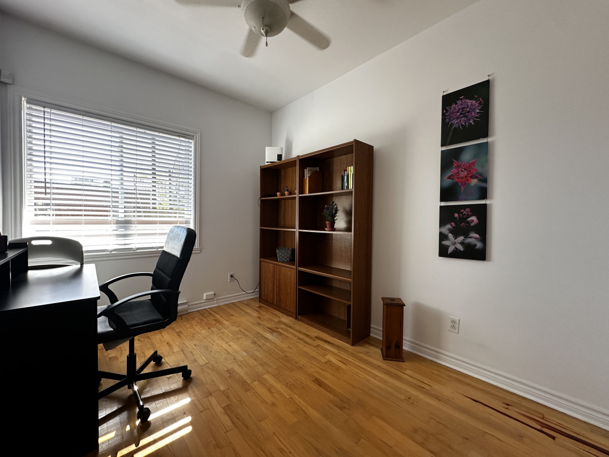 The condo is located on the second floor of the building. It has one large bedroom, one office space, and a luminous living room that leads to a nice, clean and spacious balcony. The floors are hard wood floors, the kitchen is spacious and functional, and the bathroom is very nice and spacious with shower and tub separated.